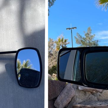 Once we arrived at the RV resort where we would be staying for the month, I began searching for better tow mirrors. I eventually found a great set on Amazon (right side of the pic). Once delivered, I quickly installed them on the truck mirrors and tested them. They worked perfectly.